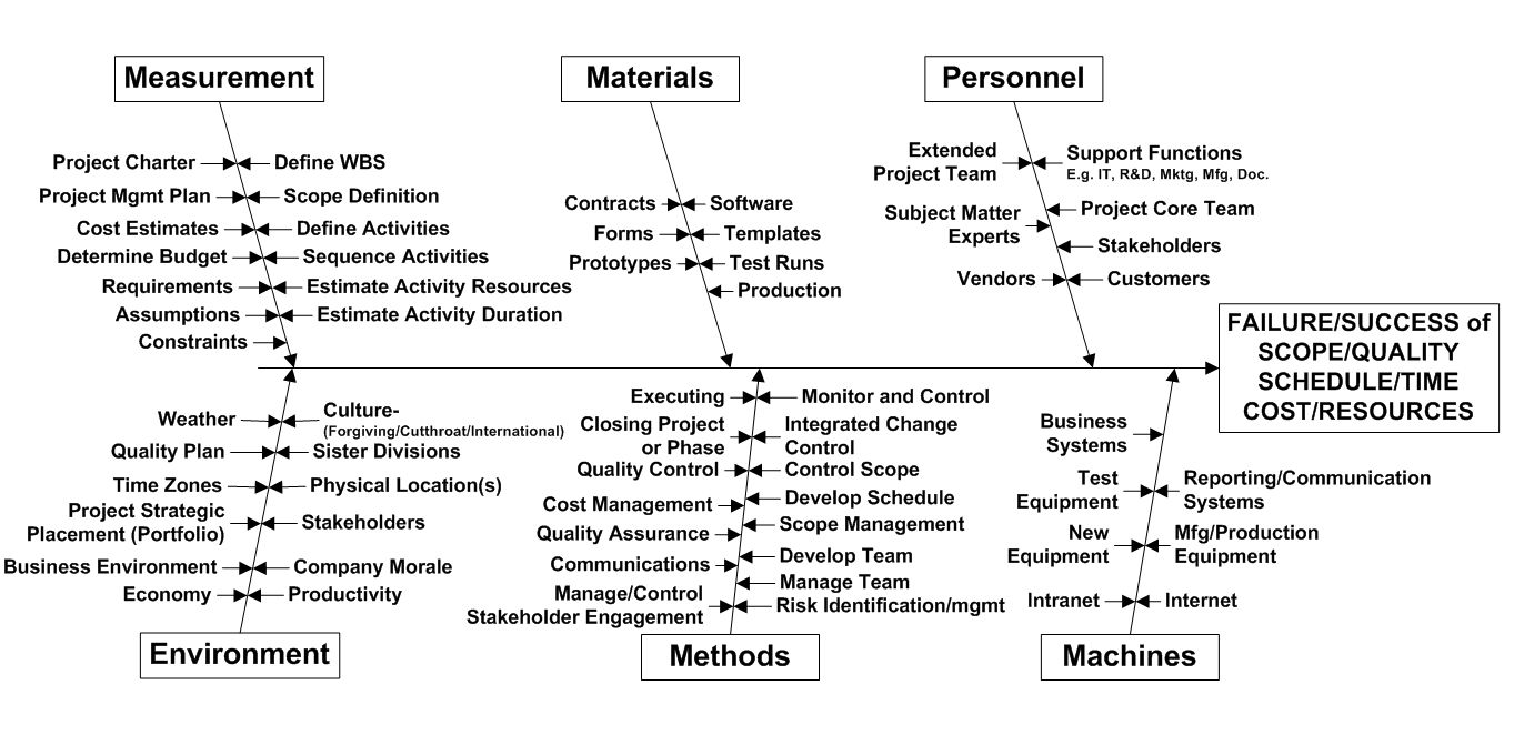 I use this example to help explain using a Cause & Effect Diagram, aka Ishikawa Diagram or Fishbone Diagram, for project risk management.  This is a simple Six Sigma Tool to assist in understanding where areas of risk may develop.  In Figure 1 below you can see the sections of the diagram.  The Effect is listed in the box on the far right.  You list ONE item of failure (or you could list a success), Scope, Schedule, or Cost. Then under the six main groupings of Measurement, Materials, Personnel, Environment, Methods, and Machines you list input factors that may have an effect on the output of  Scope, Schedule, or Cost.