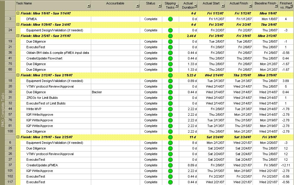 The other view that’s good to review during team meetings or right after updating the schedule is PMO_Complete Tasks.  Refer to screen shot below.  This is a report only, no inputs required, which captures all completed tasks and groups them by the week in which completed.  This is a quick way of celebrating completed tasks but also ensures those tasks that are shown as complete are indeed complete and are not there by error. All fields except the last are described above. The field Finished vs. Plan calculates the difference in days between the Actual Finish and Baseline Finish dates.
