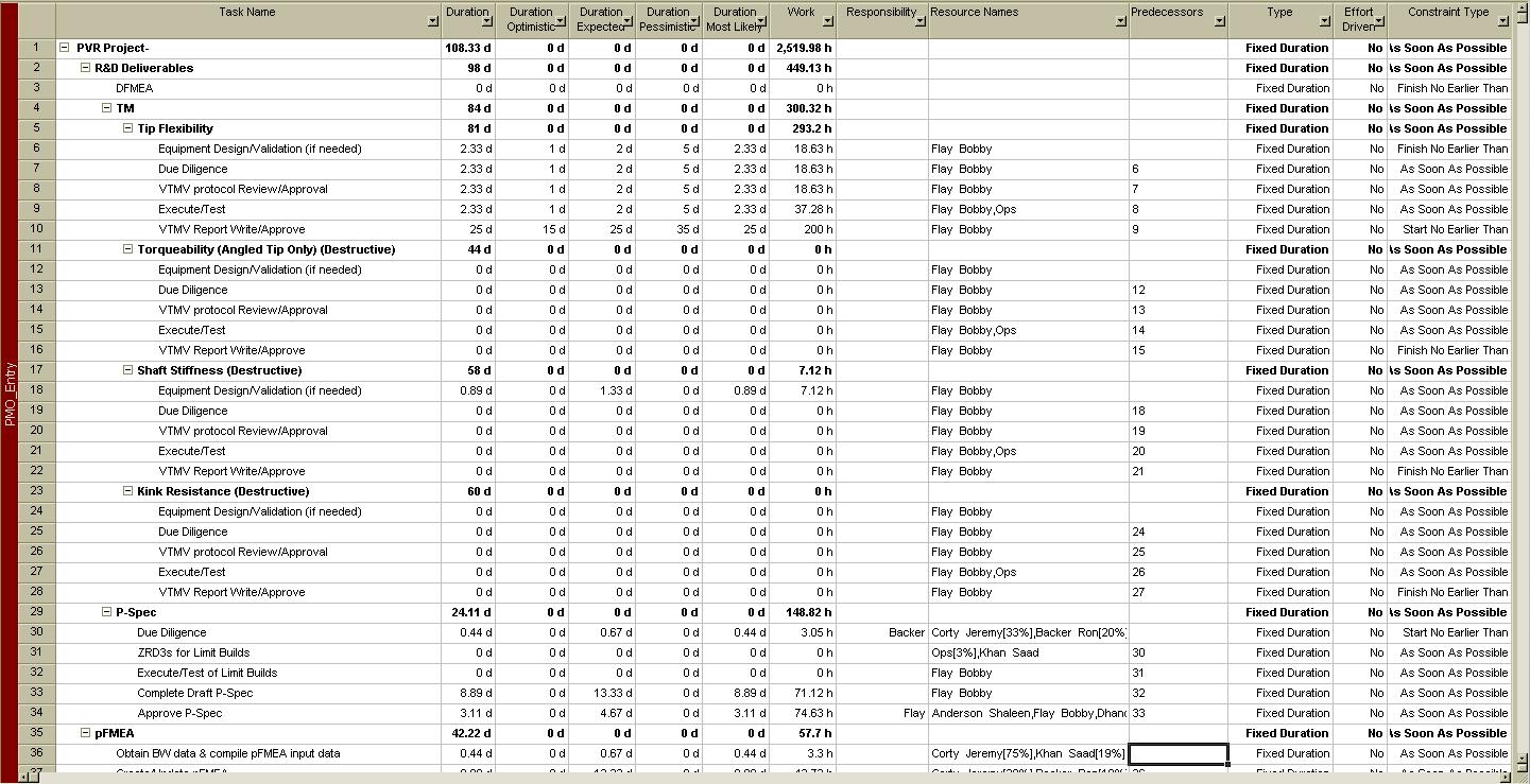 • Duration Optimistic, Expected, Pessimistic (CF) – Range of potential Durations.  Good practice is to ask others who have completed similar tasks how long it typically takes to complete the task.  This will provide a minimum, maximum and average to use for input. You don’t necessarily need to do this for every task.  Highly recommended for key tasks and tasks with wide degree of variability.