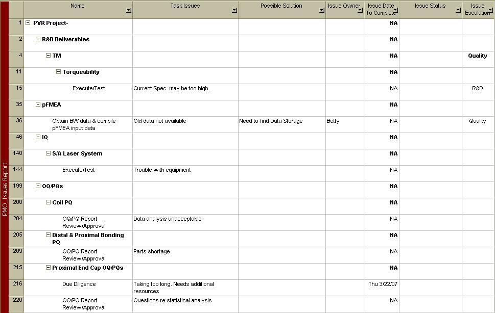 PMO_Issues Report (Outputs) Prints only incomplete tasks in which there is something printed in the Task Issues column in the PMO_Tracking Gantt.  Good for Issues tracking, management reviews and updates.