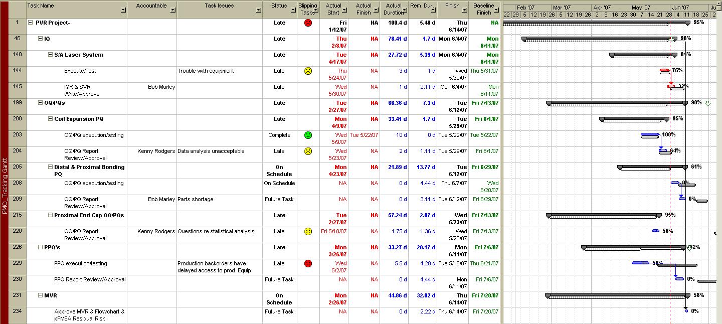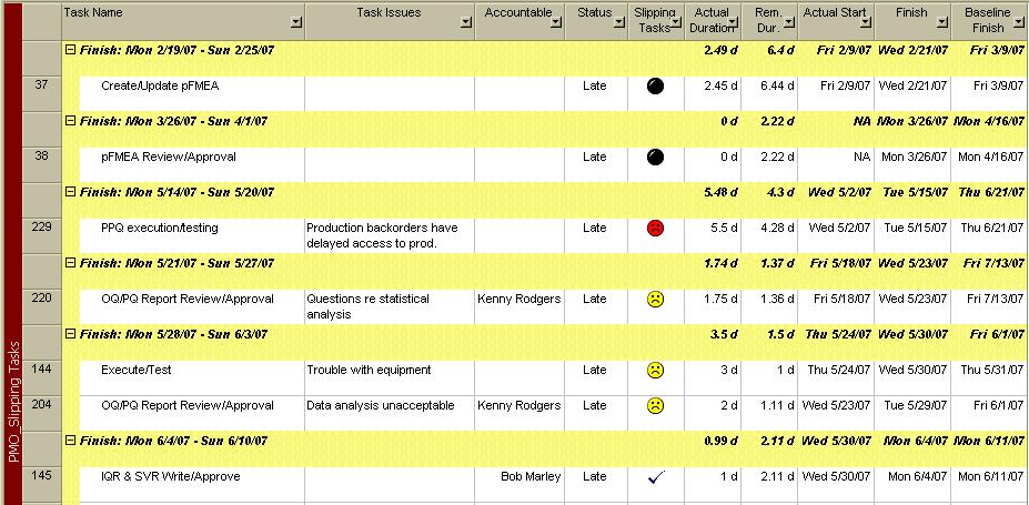 PMO_Slipping Tasks (Outputs) The print out filters and shows all tasks that are Late in the Status column OR have a value >1 in the Slipping Tasks column.  Excellent for problem solving and getting the project back on track.