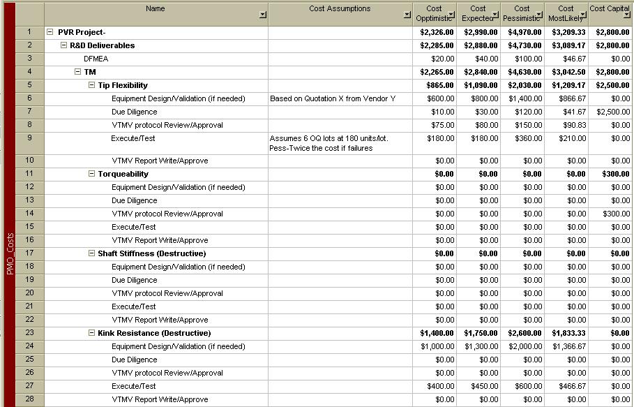 PMO_Costs (Inputs) Shows task costs.  Calculates most likely expense costs from inputted pessimistic, expected, and optimistic costs and rolls up total costs.  Also includes Capital Costs.