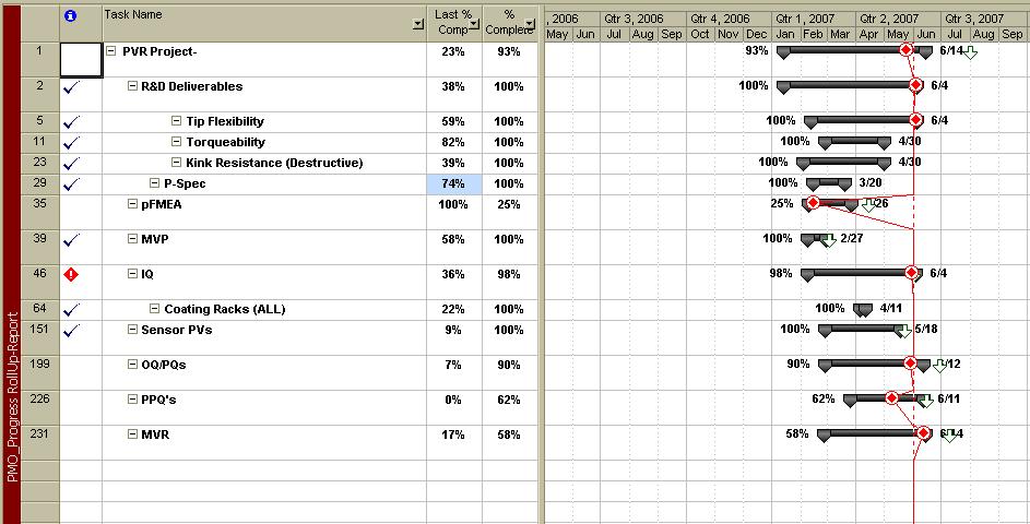 PMO_Progress Rollup-Report (Outputs) From PMO_Progress Rollup-Input generates a view that shows only those tasks that have a value in the Last % Complete column.  Adds progress line and shows current percent complete.  Placing Deadlines for key tasks will place an alert in the Indicators column if the task slips. Good for management reviews and updates.
