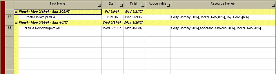 Note: Accountable and Resource Names are two of the four elements required for a RACI Matrix (Responsible, Accountable, Consulted, Informed) or RAM (Responsibility Assignment Matrix).  You could add two more columns (custom fields) titles Consulted and Informed then create a view showing the Task Name and RACI columns. You would then use Autofilter to filter for names to conduct a review.  While this method is not a standard RACI matrix (usually there are tasks running vertically and  names running horizontally across the top) it allows you create one without having to do it all over again in a spreadsheet.  This is the database part of the thinking – to keep your data in one tool, MS Project, instead of multiple files, programs, or software.